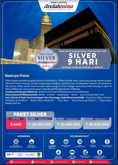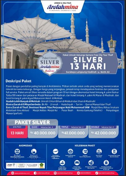 Paket dengan pendaftar paling banyak di Arofahmina. Pilihan terbaik untuk anda yang sedang merencanakan Umroh bersama keluarga. Dengan harga yang terjangkau, jamaah tetap mendapatkan fasilitas dan pelayanan full service. Paket umrah Silver tersedia dalam program 9 hari dengan akomodasi hotel bintang 4, yakni Gulnar Taiba (50 meter) di Madinah dan hotel bintang 4, yakni Mira Ajyad Hotel (200 meter) di Mekkah.