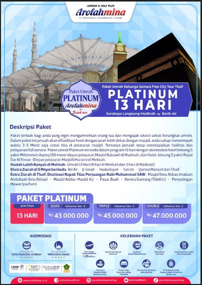 Paket terbaik bagi anda yang ingin mengumrohkan orang tua dan mengajak sikecil untuk berangkat umroh. Dalam paket ini jamaah akan difasilitasi hotel dengan jarak lebih dekat dengan masjid, anda cukup menenmpuh waktu 3-5 Menit saja untuk tiba di pelataran masjid. Tentunya jamaah tetap mendapatkan fasilitas dan pelayanan full service. Paket umrah Platinum tersedia dalam program 13 hari dengan akomodasi hotel bintang 5.