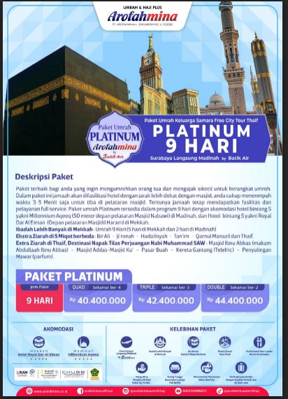 Khusus untuk anda yang ingin merasakan pengalaman umroh ekslusif dengan keluarga tercinta,pilihan dengan pelayanan, dan fasilitas Hotel Terbaik di Arofahmina. Kami menyediakan paket bagi anda yang ingin merasakan kenyamanan maximal bersama keluarga. Paket umrah VIP tersedia dalam program 9 hari dengan akomodasi hotel bintang 5,